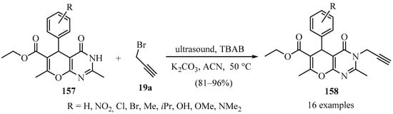 - Hai, D.S.; Ha, N.T.T.; Tung, D.T.; Le, C.T.; Anh, H.H.; Toan, V.N.; Van, H.T.K.; Toan, D.N.; Giang, N.T.K.; Huong, N.T.T.; et al. N-Propargylation reaction of substituted 4H-pyrano[2,3-d]pyrimidine derivatives under conventional, ultrasound- and microwave-assisted conditions. Chem. Pap. 2022, 76, 5281–5292. [Google Scholar] [CrossRef]