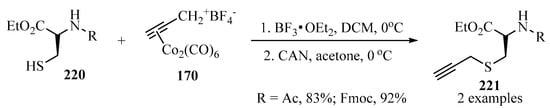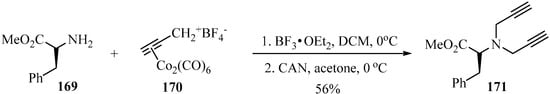 - Wells, S.M.; Widen, J.C.; Harki, D.A.; Brummond, K.M. Alkyne ligation handles: Propargylation of hydroxyl, sulfhydryl, amino, and carboxyl groups via the Nicholas reaction. Org. Lett. 2016, 18, 4566–4569. [Google Scholar] [CrossRef] [PubMed]