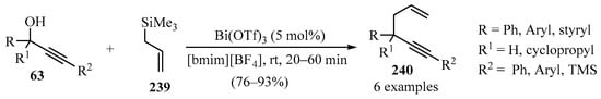 - Kumar, G.G.K.S.N.; Laali, K.K. Facile coupling of propargylic, allylic and benzylic alcohols with allylsilane and alkynylsilane, and their deoxygenation with Et3SiH, catalyzed by Bi(OTf)3 in [BMIM][BF4] ionic liquid (IL), with recycling and reuse of the IL. Org. Biomol. Chem. 2012, 10, 7347–7355. [Google Scholar] [CrossRef] [PubMed]