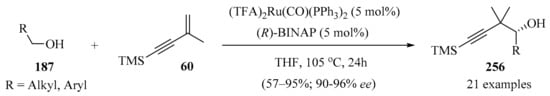 - Ambler, B.R.; Woo, S.K.; Krische, M.J. Catalytic enantioselective carbonyl propargylation beyond preformed carbanions: Reductive coupling and hydrogen auto-transfer. ChemCatChem 2019, 11, 324–332. [Google Scholar] [CrossRef]