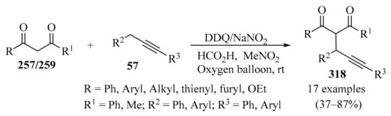 - Cheng, D.; Zhou, X.; Xu, X.; Yan, J. Propargylation of 1,3-dicarbonyl compounds catalyzed by 2,3-dichloro-5,6-dicyano-1,4-benzoquinone and sodium nitrite in the presence of molecular oxygen and formic acid. RSC Adv. 2016, 6, 52459–52463. [Google Scholar] [CrossRef]