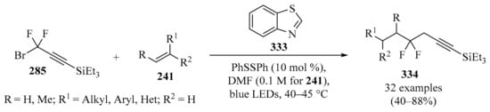 - Chen, J.; Huang, W.; Li, Y.; Cheng, X. Visible-light-induced difluoropropargylation reaction with benzothiazoline as a reductant. Adv. Synth. Catal. 2018, 360, 1466–1472. [Google Scholar] [CrossRef]