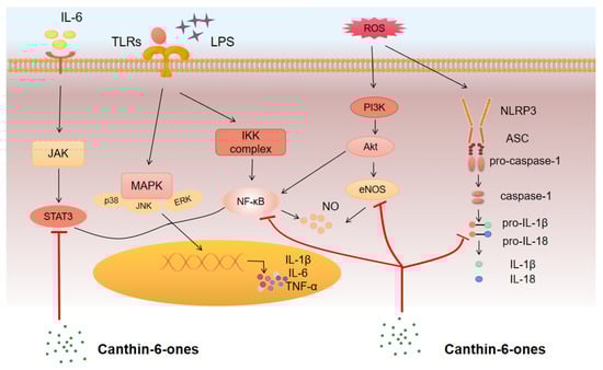 Canthin-6-ones regulate multiple signaling pathways involved in inflammation. Canthin-6-one and its many derivatives suppress the production of pro-inflammatory cytokines by targeting the activation of various signaling pathways, such as the NF-κB, JAK/STAT, and MAPK pathways. The inhibitory role of canthin-6-one in the PI3K–AKT pathway may be a concomitant event that occurs simultaneously with the inhibition of other inflammatory pathways induced by canthin-6-one. The NLRP3 inflammasome was also recently shown to be a target of canthin-6-one, which suppresses both the production and the activation of NLRP3 inflammasome components. Canthin-6-one suppresses the phosphorylation of Rac1, a key signaling molecule of the Rho–Rock pathway in inflammation and endothelial stabilization, indicating a role of this compound in endothelial repair.