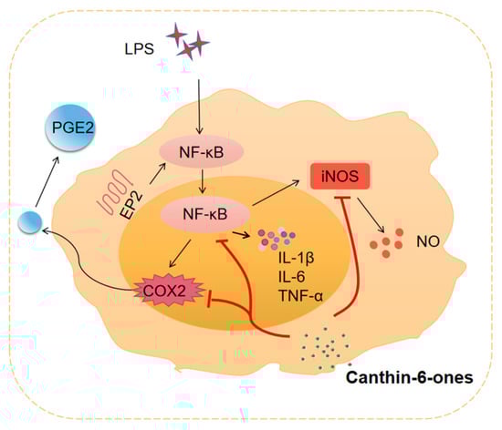 Target molecules of canthin-6-ones. Canthin-6-ones inhibit the production of pro-inflammatory cytokines, such as IL-1β, IL-6, and TNF-α, whose production can be induced by a wide variety of intracellular or extracellular stimuli, such as pathogen-derived LPS. Moreover, studies have shown that canthin-6-ones can suppress the production of NO and its regulator, iNOS. In addition, the production of PGE2 and its regulator, COX2, can be suppressed by canthin-6-ones. Activation of NF-κB mediates the production of NO, iNOS, COX2, and PGE2, which recruit many inflammatory cells, such as macrophages, to the inflammatory sites and promote chronic inflammation.