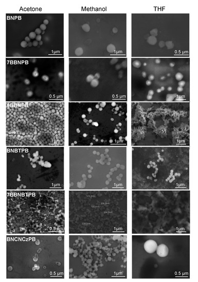 To characterize the nanostructures formed by the BN series of molecules, the morphologies of the self-assembled aggregates were observed by SEM in low-vacuum mode with no conductive overcoat. The sample chamber pressure was maintained at 0.45 Torr water using a differential pumping system. The images of the structures deposited from different solvents onto SiO2 substrates are shown in Figure 2. For all six molecules, uniform and well-defined nanospheres in the size of 200–500 nm in acetone or methanol solutions were observed. However, when drop-cast from a THF environment, the compounds exhibit greater morphological variety and may organize into different nanostructures, such as vesicles (BNPB, 7BBNPB, BNBTPB, and BNCNCzPB), films (7BBNBTPB), or clusters (8BBNPB).