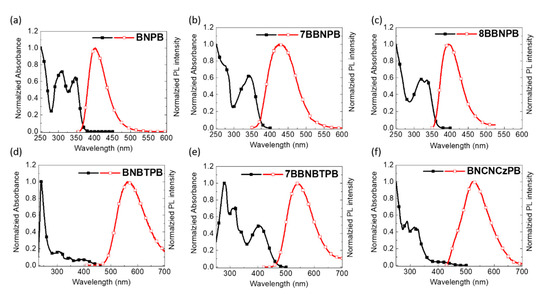 Electronic absorption and emission spectra of (a) BNPB, (b) 7BBNPB, (c) 8BBNPB, (d) BNBTPB, (e) 7BBNBTPB, and (f) BNCNCzPB in THF solutions (10–5 M, λex = 350 nm).