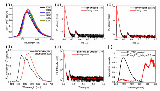 (a) Variable temperature emission spectra of BNCNCzPB in THF solution (10–5 M, λex = 350 nm). Time-resolved decay of the emission from BNCNCzPB in degassed (b) THF or (c) toluene solution at 300 K (λex = 370 nm, λem = 550 nm). (d) Emission spectra (λex = 350 nm) and (e) time-resolved decay of the emission from BNCNCzPB in degassed 2-methyltetrahydrofuran solution (5 μM) at 77 K and 300 K (λex = 370 nm, λem =550 nm). (f) Prompt (FL) and delayed (Phos) emission spectra of BNPB in frozen toluene solution (10–5 M, λex =320 nm) at 77 K. The phosphorescence spectrum at 77 K is acquired after a 0.3 ms delay.