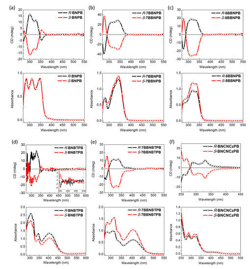 Electronic CD (top) and absorption (bottom) spectra of (a) R/S-BNPB, (b) R/S-7BBNPB, (c) R/S-8BBNPB, (d) R/S-BNBTPB, (e) R/S-7BBNBTPB, and (f) R/S-BNCNCzPB (THF, 10–5 M). The inset in (d) is the magnified ECD spectra of R/S-BNBTPB between 350–500 nm.