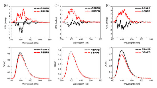 CPL spectra (λex = 300 nm) of R- and S-BNPB in THF (a) 10–4 M (b) 10–5 M solutions and (c) toluene solutions (10–5 M).