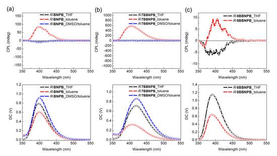 CPL spectra of (a) R-BNPB, (b) R-7BBNPB, and (c) R-8BBNPB in THF, toluene, or toluene/DMSO solutions. λex = 300 nm.