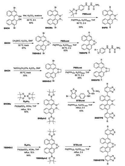 The preparation of the chiral bis-biuret chromophores is presented in Scheme 1. Compound BNOH was converted to BNOMe using MeI, followed by Pd-catalyzed Suzuki–Miyaura coupling with PBBiuret to afford target molecule BNPB. For the bridged forms [26,27], the bisdiol was linked via an SN2 reaction using methylene or ethylene groups to lock the axial chiral conformation, followed by palladium-mediated Suzuki–Miyaura coupling with PBBiuret [28] to produce 7BBNPB and 8BBNPB. For the two yellow emitters, BNOMe or 7BBNBr2 were treated with bis(pinacolato)diboron in a palladium-catalyzed reaction to give the corresponding boronic ester derivatives. These were then reacted with BTBiuret through Suzuki–Miyaura coupling to obtain BNBTPB and 7BBNBTPB.