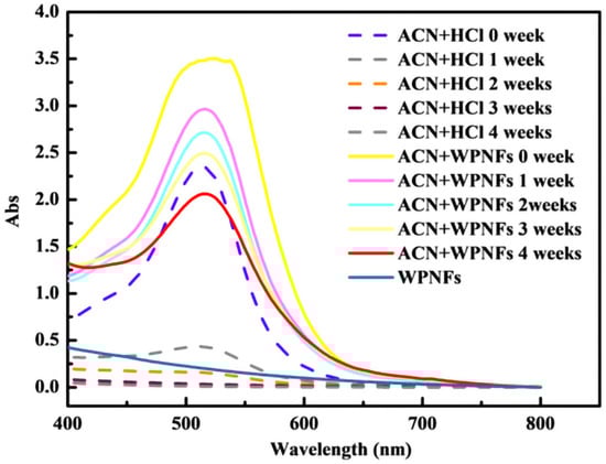 First, 4.0 mg of ACN was added to 20 mL of WPNFs solution, and the sample solution was stored at room temperature (20–25 °C) for 4 weeks. The UV/vis spectrum of the sample was measured in a wavelength range of 400–800 nm each week. The control was HCl solution (pH 2) with 4 mg ACN. The WPNFs solution and ultrapure water were used as a blank calibration for sample and control, respectively.