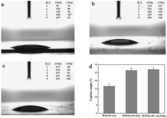 The drop shape and water contact angle of edible films; lateral photograph of water drops on the edible films: (a) WPI-PU/Gly edible film, (b) WPNFs-PU/Gly edible film, (c) WPNFs-PU-ACN/Gly edible film, and (d) comparison of water contact angle of the surface of the edible films. Different letters (a,b) represent significant differences (p < 0.05).