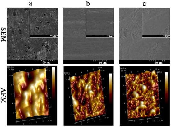 SEM and AFM micrographs images of edible films: (a) WPI-PU/Gly edible film, (b) WPNFs-PU/Gly edible film, and (c)WPNFs-PU-ACN/Gly edible film.