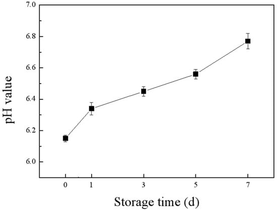 Fish contains a variety of unsaturated fatty acids, proteins, free amino acids, and endogenous enzymes, and it is susceptible to being oxidized and degraded by microorganisms. We used salmon as an indicator and measured its pH changes while stored at 25 °C for 7 days. As shown in Figure 5, the pH of the salmon increased gradually with the increase of storage time. The protein in the salmon was broken down and produced ammonia compounds and other alkaline substances, which increased the pH. This was consistent with the results of Huang et al. [], who found that the pH of salmon increased with the prolongation of its storage period at 25 °C. Texture is a valuable quality indicator that influences the sensory and functional characteristics of fish. In our study, hardness, chewiness, and resilience were used as indexes to evaluate the texture characteristics. The TPA of salmon from Table S2 showed that the hardness, resilience, and chewiness of salmon all decreased with the increase of storage time. During the storage process, salmon gave off a slight spoilage odor and produced a small amount of juice from the third day onwards. As the storage period extended, the odor of spoilage became intense, and the surface color of salmon became significantly lighter.