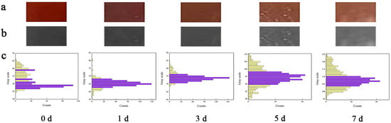 The color change of WPNFs-PU-ACN/Gly edible film and the corresponding grayscale range at 25 °C for different storage times (0, 1, 3, 5, and 7 days): (a) actual color change of WPNFs-PU-ACN/Gly edible film, (b) color change of WPNFs-PU-ACN/Gly edible film after grayscale, (c) grayscale range corresponding to the color change of WPNFs-PU-ACN/Gly edible film.