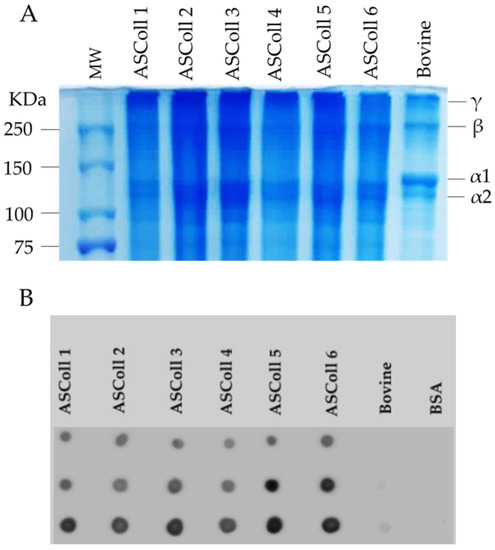 Molecular profile of ASColl. (A)—Electrophoresis profile from the ASColl samples and type I collagen from bovine skin. MW—molecular weight standard protein marker. (B)—Dot blot analysis of the ASColl samples and type I collagen from bovine skin. BSA—Bovine serum albumin; bovine—type I collagen from bovine skin.