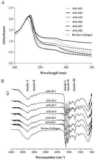 In order to analyze the collagen extracted from Atlantic codfish skin and to assess its respective molecular weight, the ASColl samples were separated by SDS-PAGE, and compared with the pattern from a commercial bovine skin type I collagen sample. As shown in Figure 1A, the characteristic type I collagen bands can be identified in all samples. The α1 and α2 chains are found with molecular weights between 100 kDa and 150 kDa, while the β and ϒ chains are found above 250 kDa, which corresponds to dimers and trimers of the α chains, respectively, being in agreement with previous studies in other species [39,43]. Moreover, the SDS-PAGE profile is identical between every ASColl sample, supporting the hypothesis of identical structures between ASColl samples from different extractions, indicating a reproducible extraction method and equivalent codfish skin batches. Moreover, the electrophoretic profiles of the ASColl samples are similar to the one exhibited by bovine type I collagen, although with smaller molecular weights observed in fish samples, which is in accordance with what is described in the literature [2].