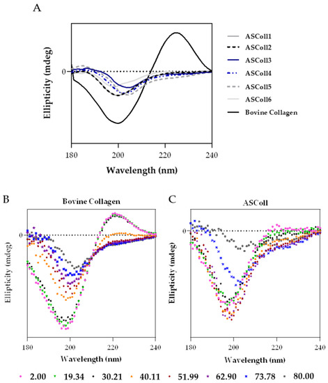 Circular dichroism (CD) analysis of ASColl. (A)—CD spectra of the ASColl and the commercial type I collagen from bovine skin, acquired at 25 °C. (B)—CD spectra of the commercial type I collagen from bovine skin, recorded as a function of temperature, between 2 °C and 80 °C. (C)—CD spectrum of the ASColl, recorded as a function of temperature, between 2 °C and 80 °C.