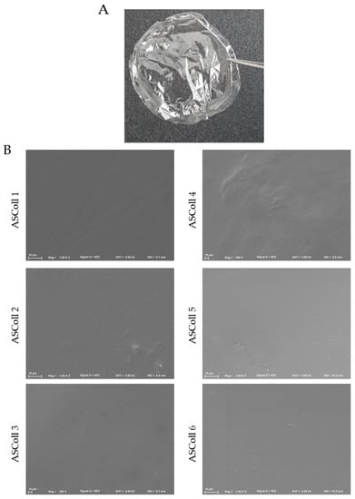 A stable and detachable collagen membrane (Figure 6A) was produced by solvent casting of ASColl solutions, as described in the Materials and Methods section. Macroscopically, the membranes were morphologically similar, transparent and colorless and, when dry, presented enough resistance to be easily handled. These characteristics are similar to other biomaterials produced by Elango and colleagues [55]. Moreover, these features can be advantageous in a biomedical context, for instance by allowing wound healing monitoring [61].