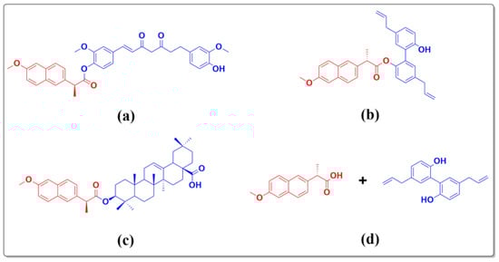 The reported naproxen derivatives and naproxen combined with magnolol. (a) naproxen derivative containing curcumin, (b) naproxen derivative containing magnolol, (c) naproxen derivative containing oleanolic acid, and (d) naproxen combined with magnolol.