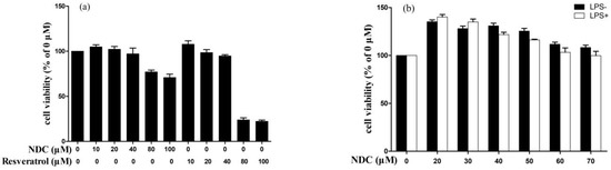 Effect of NDC and resveratrol on the viability of the RAW264.7 cells, (a) NDC or resveratrol (0–100 μM) without LPS, (b) NDC (0–70 μM) with or without LPS (2 μg/mL), (c) resveratrol (0–35 μM) with or without LPS (2 μg/mL), and (d) NDC (0–70 μM) and resveratrol (0–35 μM) in combination with or without LPS (2 μg/mL), n = 3.