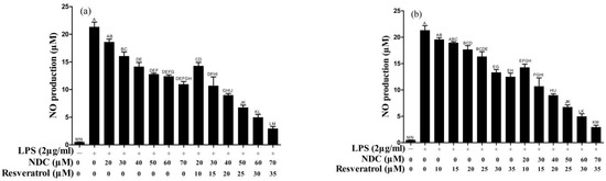 It was indicated that once the RAW264.7 cells were stimulated by LPS, iNOS would be released in the cells, and then a large amount of NO, that was mediated by iNOS, would become synthesized in the cells, and cause severe inflammation [24]. Thus, blocking the NO synthesis may be considered an effective strategy to improve the inflammatory reaction. In the present study, the inhibition of NDC and resveratrol on the NO levels was investigated using LPS-induced RAW264.7 cells as a model. As described in Figures S1 and Figure 3, the NO levels of the RAW264.7 cells stimulated with LPS markedly increased. In addition, NDC and resveratrol, individually or combined, dependently suppressed LPS-induced NO production (Figure 3a,b). Interestingly, NDC combined with resveratrol provided a stronger inhibition of LPS-induced NO production than NDC or resveratrol alone (Figure 3a,b). The results demonstrated that pretreatment with NDC (70 μM) and resveratrol (35 μM) individually, caused a 48.73% and 41.47% decrease in the NO levels, respectively. However, pretreatment with a combination of NDC and resveratrol resulted in an 86.31% reduction in LPS-induced NO production.
