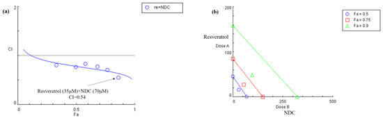 Combination index analysis for the inhibition of LPS-induced NO treated with NDC or resveratrol alone, or a combination of both. (a) Combination index plot, (b) isobologram for the combination of NDC and resveratrol.