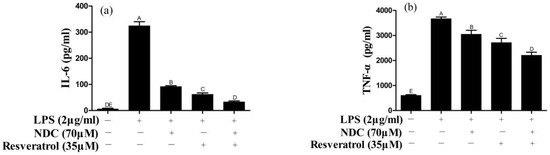 Effect of NDC and resveratrol on LPS-induced IL-6 (a) and TNF-α (b). Groups that do not share the same letter are significantly (p < 0.01) different from each other. The letters are in order of average size, n = 3.