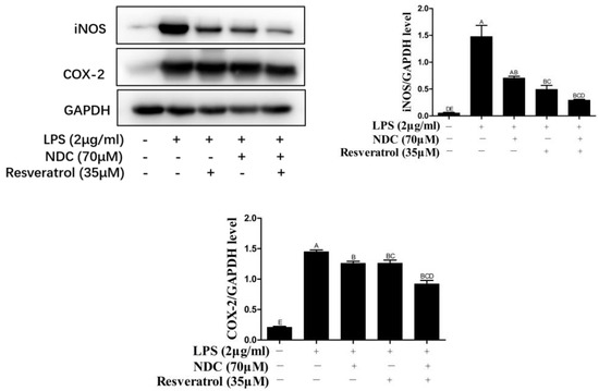 Effect of NDC and resveratrol on the expression of iNOS and COX-2 in LPS-induced RAW264.7 cells. Groups that do not share the same letter are significantly (p < 0.01) different from each other. The letters are in order of average size, n = 3.
