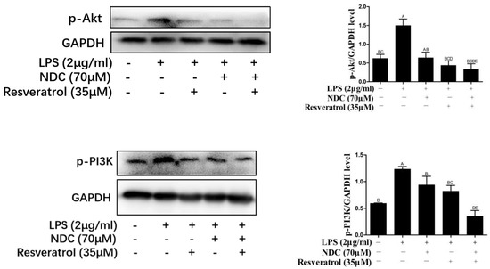 Effect of NDC and resveratrol on LPS-induced PI3K/Akt pathways in RAW264.7 cells. Groups that do not share the same letter are significantly (p < 0.01) different from each other. The letters are in order of average size, n = 3.