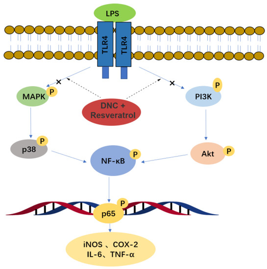 RAW264.7 cells were seeded in a 6-well plate at a density of 1 × 106 cells per well. Twenty-four hours later, the RAW264.7 cells were pretreated with NDC (70 μM) or resveratrol (35 μM) alone, or NDC (70 μM) combined with resveratrol (35 μM) for 2 h, and LPS at a dose of 2 μg/mL was added to induce an inflammatory response. The total protein was extracted by lysis of cells with a cell lysis reagent at 1 h (PI3K, Akt), 6 h (p-p38, p-p65) and 12 h (iNOS, COX-2), respectively. The protein content in lysate was determined using a BCA protein analysis kit. The total protein was separated by sodium dodecyl sulfate polyacrylamide gel electrophoresis (SDS-PAGE) and transferred to the polyvinylidene fluoride membrane. Then, the sample was blocked with 5% (w/v) skim milk powder at 4 °C overnight, and then shaken with specific primary antibodies for 2 h at room temperature, followed by incubation with horseradish peroxidase (HRP) tagged secondary antibodies for 1 h at room temperature. Finally, the imprinting was detected using enhanced chemiluminescence (ECL) and automatic radiography.