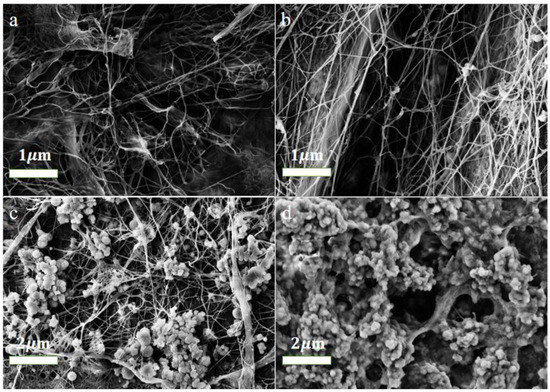 The morphology of the original BC membrane and other three composite membranes were analyzed by SEM. Figure 1a shows the three-dimensional, extensively interwoven nanometer shape of the pristine bacterial cellulose, with a fiber diameter of about 30 nm. After coating the PDA layer, the diameter of these fibers efficiently increases to approximately 90 nm, demonstrating the effect of poly-dopamine on the thickness of the membrane, as viewed in the BC/PDA sample in Figure 1b. We can also see that the PDA coating is uniformly loaded on the BC fiber, which facilitates subsequent loading of other substances. The BC/PDA/TiO2 sample in Figure 1c actually shows the distribution of TiO2 nanoparticles along the fiber. Titanium dioxide particles aggregate on the surface of the membrane and are uniformly loaded on the BC fibers, constructing a micro–nano structure which is indispensable for the hydrophilicity of the membrane. Due to the large specific surface area, nano-TiO2 has stronger UV absorption capacity, so it has stronger photocatalytic ability. In the case of the BTA, Figure 1d indicates that the 3D mesh structure was not destroyed, and that the surface of the composite membrane has a honeycomb porous morphology with a random distribution of pores after the addition of SA. These holes can effectively help us separate oil and water.