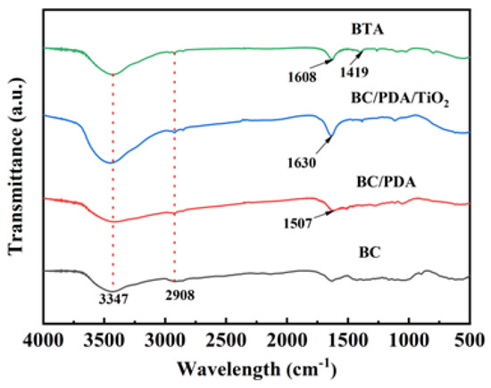As shown in Figure 3, the chemical structures of the original BC membrane and the other three composite membranes were analyzed by FT-IR. The stretching vibrations of the O-H, CH2-CH, and C-O bonds, respectively, are represented by the adsorption peaks of the original BC membrane at 3347, 2908 and 1050 cm−1. The intensity of these peaks decreased after the BC membrane was loaded with PDA and further decreased after the TiO2 was loaded. The adsorption height at 1507 cm−1 in BC/PDA corresponds to the C-N stretching vibration. After the BC membrane was loaded with PDA and TiO2, the absorption peak of the sample membrane at 1630 cm−1 corresponds to the telescopic vibration of Ti-O [37]. With respect to asymmetric and symmetric -COO- stretching vibrations and -OH stretching, respectively, BTA exhibits unusual peaks at 1608 cm−1 and 1419 cm−1. It also has a broader adsorption band for -OH stretching at 3364 cm−1 [38].