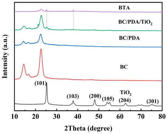 Figure 4 shows the crystal structure of the original BC membrane and the other three composite membranes using XRD. Typical peaks of crystalline cellulose at 14.5° and 22.3° can be considered in each the BC and BC/PDA samples, and these peaks were obviously shielded after TiO2 loading and SA loading, probably due to the coating of the nanometer surface [39]. In the BTA sample, 25.31°, 37.90° and 48.02° correspond to the (101), (103) and (200) planes of the crystal diffraction anatase TiO2, respectively (JCPDS No. 21-1272). In BTA samples, sodium alginate does not exhibit diffraction peaks in XRD. In addition, due to the secondary loading of sodium alginate on the basis of titanium dioxide, the peak strength of titanium dioxide is greatly weakened.