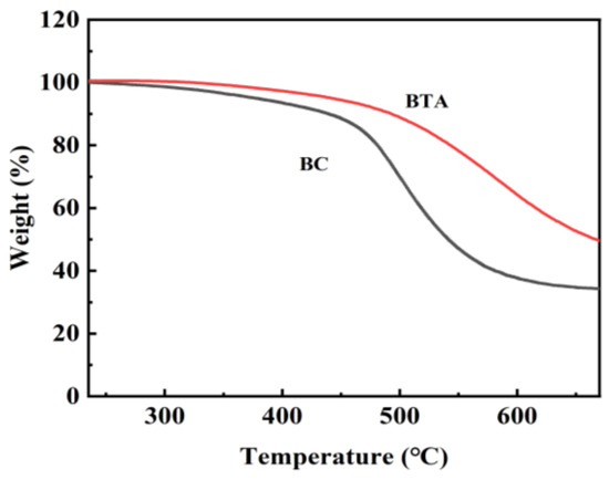 We analyzed the thermal stability of the original BC membrane and the composite BTA with thermogravimetry (TGA). Figure 5 shows the thermogravimetric curves of BC membrane and BTA. BC membrane mass loss suddenly becomes greater at 450 °C because BC is a biomass material that quickly loses weight and carbonizes at high temperatures. In contrast, after loading PDA and TiO2, the thermal stability of BTA is significantly improved due to the heat resistance of dopamine and the coordination of metal Ti. This also proves that BTA has good thermal stability.