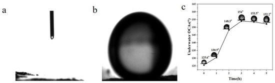 (a) Contact angle image of water is 0°. (b) Underwater oil contact angle is 156.5°. (c) The change of oil contact angle under UV light in 0~5 h.