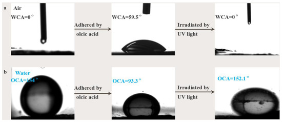 (a) The change of water contact angle (WCA) of the BTA by UV light. (b) The change of oil contact angle (UOCA) of the BTA by UV light.