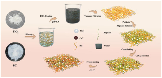 On the basis of BC and TiO2, through a simple vacuum-assisted filtration process, the composite PDA adhesive forms a composite membrane. First, an ultrasonic cleaner was used to pour titanium dioxide nanoparticles (0.04 g) into distilled water (50 mL) for 10 min. Then it was placed on a magnetic stirrer and stirred for 10 min. At the same time, the BC membrane (0.3 g) was evenly broken with a homogenizer, added to distilled water (100 mL) and stirred for 20 min. Then the evenly stirred titanium dioxide solution was poured into the BC solution and stirred for 1 h with a magnetic stirrer to mix it well. Afterwards, the pre-configured tris(hydrometry) amino-methane (0.2 g) and dopamine (0.46 g) mixed solution were taken out. Then a mixed solution of BC and titanium dioxide was poured into it and stirred for 6 h. Finally, the mixed solution was filtered through suction in a vacuum filter to obtain a preliminary composite TiO2 membrane, and then finally a composite membrane was obtained after freeze-drying for 24 h. Poly-dopamine was uniformly loaded on the surface of the BC membrane, and nanometer TiO2 particles were uniformly loaded on the BC fibers.