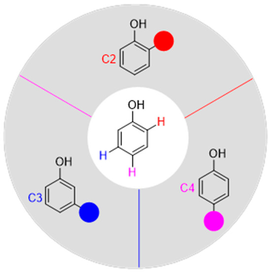 Some reviews on the transition-metal-catalyzed functionalization of C–H bonds in phenols have been reported so far. Lumb and co-workers [11] wrote a review on phenol-directed C–H functionalization in 2018. Luo [12] summarized the progress of the transition metal-catalyzed directing-group-assisted C–H activation of phenols until 2019. Immediately afterward, Mamari [13] outlined a comprehensive advance in regard to metal-catalyzed C–H bond functionalization of phenol derivatives in 2020. Later, Youn and co-workers [14] reported a comprehensive overview of transition-metal-catalyzed ortho-selective C–H functionalization reactions of free phenols until 2021. Recently, Zhai [15] published an excellent review on recent advances in catalytic oxidative reactions of phenols and naphthalenols. We want to focus on the recent development on the C–H functionalization of different positions on the free phenol aromatic ring. Thus, we will summarize recent advances since 2018 in regioselective C–H bond functionalization of free phenols in this review. This review is classified into three sections according to the position of functionalization, treating ortho-, meta-, and para-positions of free phenol successively, and only some selected examples are described schematically (Figure 1).