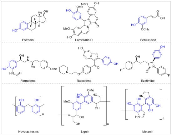 Phenols are readily available and have emerged as ubiquitous building blocks in natural products, pharmaceuticals, and functional materials [1,2,3,4,5,6]. For example, many natural products such as hormones, antibiotics, vitamins, and neurotransmitters are derived from or contain phenols; Approximately, more than 10% of the top 200 selling pharmaceuticals bear at least one phenol or employ phenols as synthetic intermediates; phenols are also key components of functional materials such as polymer resins (Scheme 1). Consequently, straightforward and highly efficient site-selective C–H bond functionalization of free phenols has continuously attracted the attention of organic chemists [7,8,9,10].