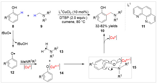 Simultaneously, Patureau’s group [20] reported a highly selective Cu(II)-catalyzed cross-dehydrogenative ortho-aminomethylation of free phenols 8 with aniline derivatives 9 using Di-tert-butyl peroxide (DTBP) as an oxidant. As illustrated in Scheme 3, a series of aminomethylated products 10 were obtained with 32–82% yields and based on controlled experiments; the authors proposed that this reaction involved the aminomethyl radical 13 by a Cu-centered six membered transition state 15. However, this method required an excess of amines (6.3–9.5 equiv.) and only tertiary N-methyl aromatic amines were compatible with the reaction system, which limited its synthetic utility.