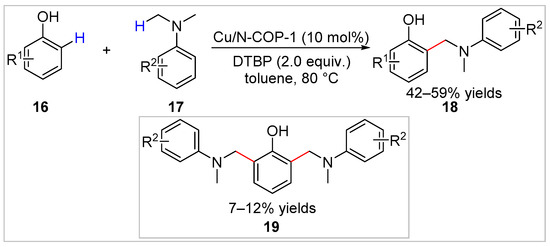 In 2021, a copper(II)-modified nitrogen-rich covalent organic polymer (Cu/N-COP-1) was prepared and employed to achieve the cross-dehydrogenative ortho-aminomethylation of free phenols 16 with N,N-dimethylanilines 17 under mild conditions by Xie et al. [21]. Various aminomethylated products 18 were obtained in 42–59% yields (Scheme 4). In addition, the catalyst could be easily reused for at least five consecutive runs without significant loss of catalytic activity, which is attributed to the interaction between the nitrogen-containing group of the covalent organic polymer and copper chloride. Having the di-substituted products 19 and moderate yields (mostly 42–59%) of the desired products were the drawbacks of this method.