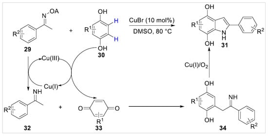 One year later, Xie’s group [23] developed a copper-catalyzed tandem cross-coupling/annulation of free phenols 30 with ketoximes 29 via dual C–H functionalization. A variety of oximes, including 1-naphthyl-bearing oxime and heteroaryl-bearing oximes, were compatible for this reaction system and afforded the corresponding products 31 in good yields. Control experiments disclosed that the benzoquinone 33 might be the vital intermediate of the dual C–H functionalization reaction, as the para-dihydroxyl was crucial in the process of reaction (Scheme 6).