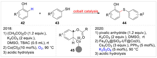 In 2018, Khakyzadeh, Zolfigol, and co-workers [25] disclosed a Co(II)-catalyzed regioselective synthesis of 2-(aryl/alkylthio)phenols 44 via formal C–H bond functionalization of free phenols 42 with aryl/alkyl thiols 43 using acetic anhydride as the directing group under mild conditions. A variety of 2-(aryl/alkylthio)phenols 44 were obtained with moderate to excellent yields (Scheme 8). In addition, 2-naphthol and 1-naphthol were also compatible with this reaction system. Later, this reaction was further developed through Fe3O4@SiO2-UT@Co(II), using pivalic anhydride as the directing group, by Khaef et al. [26]. In fact, the two reactions were stepwise processes. By introducing directing groups to protect the hydroxyl group, the ortho-C–H functionalization of phenol was achieved. Finally, 2-(aryl/alkylthio)phenols were obtained by an acidic hydrolysis strategy. Depending on the control experiment, both thiolation reactions may undergo a process of free radicals 45.