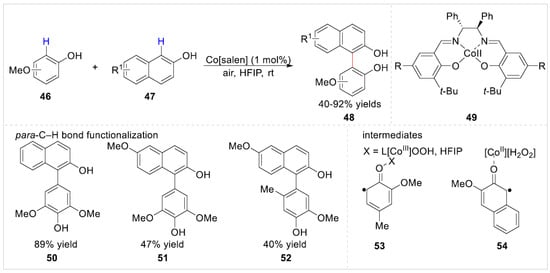 In 2019, a Cobalt(II)[salen]-catalyzed selective aerobic oxidative cross-coupling of electron-rich free phenols 46 with 2-naphthols 47 was developed by the Pappo group [27] in a recyclable 1,1,1,3,3,3-hexafluoropropan-2-ol (HFIP) solvent. A variety of nonsymmetric biphenols 48 were obtained with 40–92% yields under mild waste-free conditions by a selectivity-driven catalyst design approach. However, the nonsymmetric biphenols 50, 51 and 52 were obtained by the para-C–H bond functionalization rather than ortho-positions of free phenols with 2-naphthols (Scheme 9). Besides, a strong electron-withdrawing group such as ester was not compatible with the current system, failing to afford the corresponding biaryl coupling product. Detailed control experiments and kinetic studies suggested that a liberated phenoxyl radical 53 and a ligated 2-naphthoxyl radical 54 were involved in the reaction pathway.