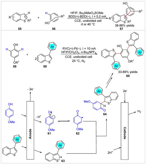 The highly efficient arylation of benzothiophenes 55 with free phenols 56 was realized by the Waldvogel group [34] under exogenous oxidant-free and metal catalyst-free electrochemical oxidation conditions in 2018. The 2- or 3-(hydroxyphenyl)benzo[b]thiophenes 57 were regioselective, obtained with 38–88% yields in an undivided cell equipped with a BDD anode and a BDD cathode at a constant current of 5.2 mA/cm2, using Bu3NMeO3SOMe as the electrolyte at RT or 40 °C (Scheme 10). Later, Yue et al. [35] developed an electrochemical oxidative C–H/C–H coupling of free phenols 58 with 3-phenylbenzothiophenes 59, which delivered highly tunable benzothiophene derivatives 60 with 33–89% yields in an undivided cell equipped with a RVC anode and a Pt plate cathode at a constant current of 10 mA, using n-Bu4NPF6 as the electrolyte at 25 °C under the protection of nitrogen (Scheme 10). Both monofunctional and bifunctional groups could be achieved in this electrochemical oxidation reaction under external oxidant- and catalyst-free conditions. However, the thiophene and benzothiophene were not compatible with the reaction system. Control experiments suggested that a cross-coupling process between the p-methoxylphenol radical 62 and the 3-phenylbenzothiophene radical cation 63 might be involved in this electrochemical transformation.