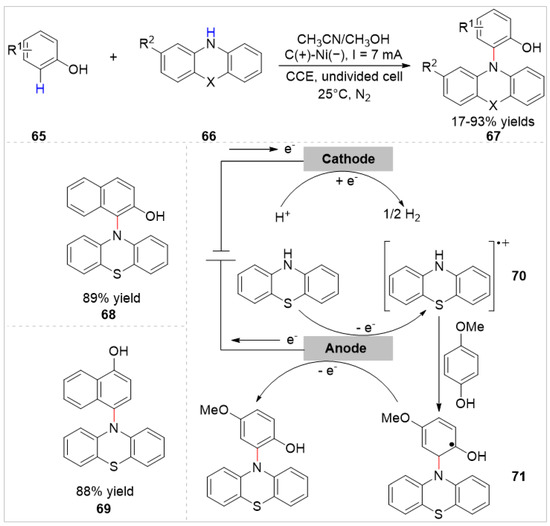 In 2018, the Lei group [36] reported an electrochemical oxidative C–H amination of free phenols 65 with phenothiazine derivatives 66 under metal catalyst- and chemical oxidant-free conditions. A host of N-aryl phenothiazines 67 were obtained with 17–93% yields in an undivided cell equipped with a graphite rod anode and a nickel plate cathode at a constant current of 7 mA, using n-Bu4NBF4 as the electrolyte at room temperature under nitrogen protection (Scheme 11). Notably, 2-naphthol and 1-naphthol were also compatible with this reaction system, the products of the ortho-C–H bond functionalization of 2-naphthol and the para-C–H bond functionalization of 1-naphthol were obtained in 89% yield and 88% yield, respectively. Besides, the electro-oxidative double C–H amination of ortho-substituted phenols was also observed in this reaction. Based on cyclic voltammetry (CV) experiments, the authors proposed that the electrocatalytic amination reaction involved the oxidation of amine substrate to generate the radical cation 70.