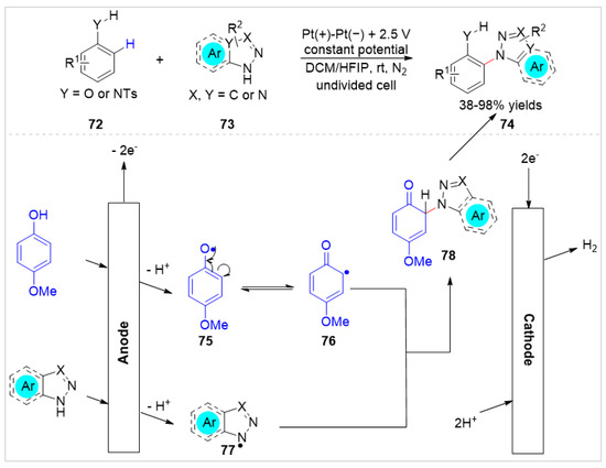 Subsequently, Feng et al. [37] reported an electro-oxidative and regioselective C–H azolation of free phenols 72 under external oxidant-free conditions with H2 evolution. The electrosynthesis proceeds in a simple undivided cell equipped with two platinum electrodes at a constant potential of 2.5 V, using n-Bu4NPF6 as an electrolyte at room temperature under the protection of nitrogen. Moreover, the para-methoxyl aniline derivatives were successfully employed as the reaction substrate under standard conditions. Detailed experiments and cyclic voltammetry studies suggested that a radical coupling process between the carbon radical 76 and the nitrogen-centered radical 77 might be involved in this electrochemical transformation (Scheme 12).