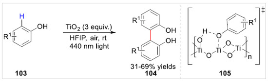Subsequently, a photocatalytic oxidative coupling of free phenols 103 with alkenylphenols was reported, using a recyclable heterogeneous titanium dioxide photocatalyst in air and visible light, by Kozlowski group [42]. When 2,6-dimethylphenol and 2-isopropyl-5-methylphenol were used as substrates in homo-coupling reaction, the para-C–H bond functionalization was observed. The incomplete conversion with moderate yields of the desired products limited the application of the reaction. The bare leak of the phenol hydroxyl group played a key role in the reaction, since anisole was incompatible with this reaction system. Depending on the control experiment, the authors proposed that this reaction may involve the TiO2–phenol complex 105, which was activated through a ligand to metal charge transfer effect (LMCT) (Scheme 17).